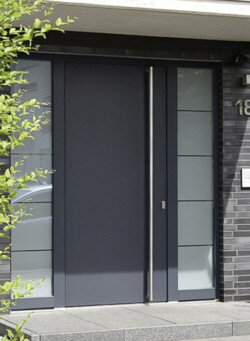 Wenn es um modernes Türdesign geht, sind heute klare Linien und einfache geometrische Formen, gerne in Kombination mit dezenten Applikationen gefragt. Stellvertretend hierfür steht das Modell 6864-54, welches durch seine betont schlichte, zurückhaltende Gestaltung in Kombination mit akzentuiert eingesetzten Lisenen den Zeitgeist widerspiegelt. Umso mehr freuen wir uns, Ihnen ein schönes Objektbeispiel aus Schleswig-Holstein vorstellen zu dürfen. Die flügelüberdeckende Aufsatzfüllung in der Trendfarbe Grau – farblich abgestimmt auf die Fensterelemente – fügt sich hier hervorragend in den Stil des Wohnhauses in Scharbeutz an der Ostsee ein. Zwei Ganzglas-Seitenteile, die Licht und Atmosphäre in das Hausinnere bringen, komplettieren das Gesamtbild der großzügigen Eingangslösung.