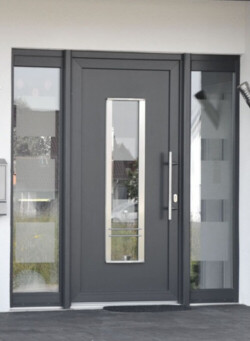 Vier seitlich versetzte quadratische Lichtausschnitte verleihen der anthrazitgrauen Haustürfüllung ihre charakteristische Optik. Unterstrichen wird das geradlinige Design durch akzentuiert eingesetzte Applikationen in Form flächenbündiger und somit pflegeleichter Lisenen im Edelstahldesign. Die senkrecht und waagerecht verlaufenden Gestaltungselemente integrieren sich hier auf dezente Weise in die Füllungsfläche. Nicht zuletzt wissen die Hausbesitzer die großzügige Optik einer Aufsatzfüllung zu schätzen und machen sich deren bessere Wärmedämmeigenschaften sowie sicherheitstechnischen Vorteile zunutze.
